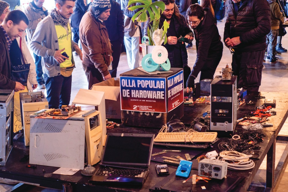 “Estamos más vinculados al arte y los videojuegos, hacemos eventos con esas cosas. Producimos videojuegos, controles alternativos y experiencias lúdicas”, explica Moco, integrante de la célula de Buenos Aires. Cada dos meses, aproximadamente, organizan El Club del Cybercirujeo, donde invitan a todo tipo de cartoneros digitales a exponer sus inventos y dispositivos en pos de demostrar que casi cualquier aparato puede tener una segunda vida útil: desde gente que hace música con controladores retro, como Gameboys, hasta el experimento de instalar el juego Doom II en un viejo posnet de tarjetas de crédito. También se dan charlas y funciona como un espacio social y de encuentro.