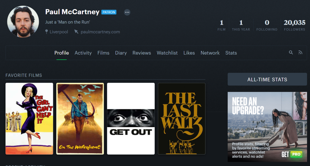 Paul McCartney inauguró su perfil en la plataforma de crítica y catálogo cinematográfico Letterboxd y compartió sus cuatro películas favoritas de todos los tiempos.