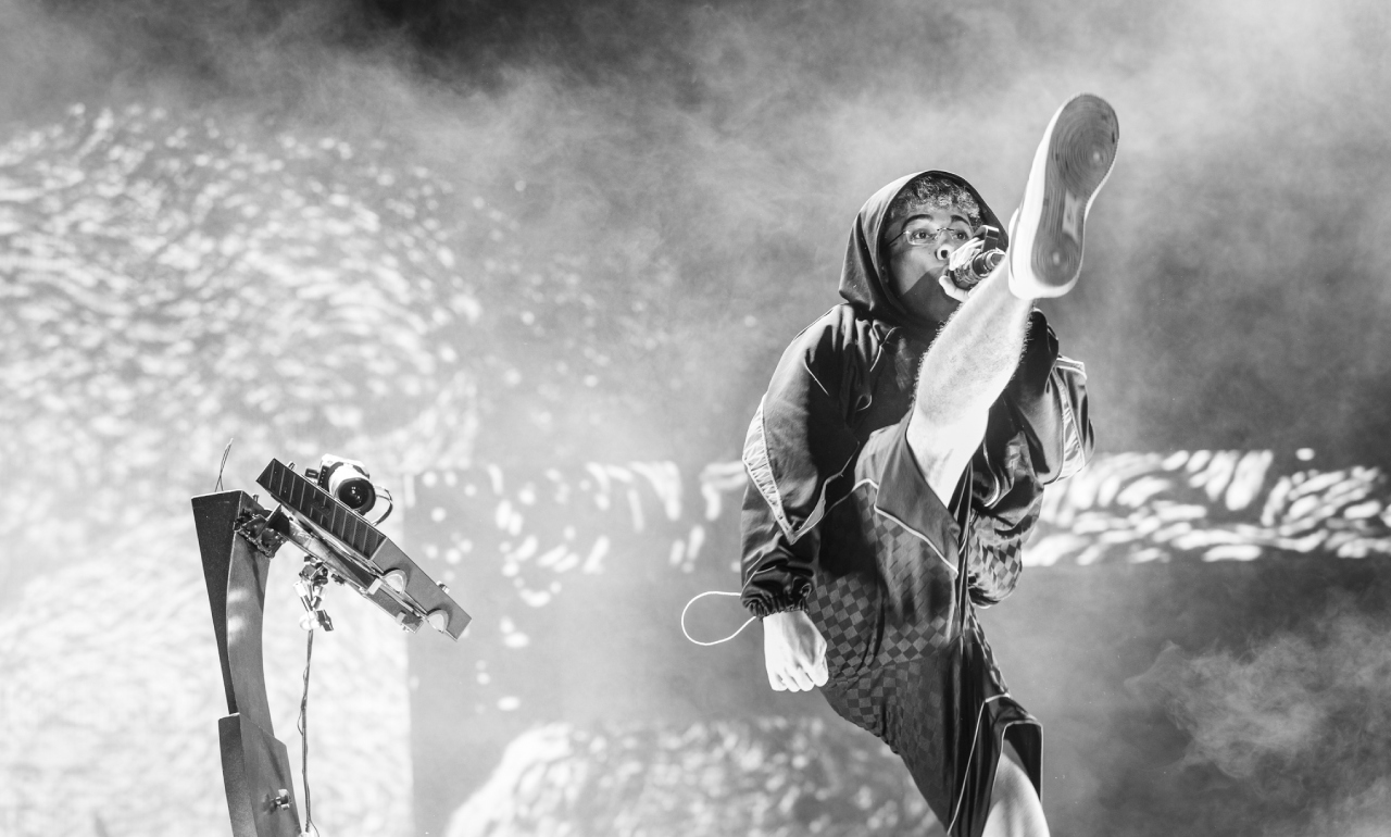 Después de haber mostrado los matices a los que podía aspirar su música, en el tercer segmento Trueno prefirió ir por los purismos: “The roof is on fire” trajo de nuevo al rap vieja escuela al show, con su padre, MC Peligro, como socio necesario para la arenga, justo antes de que el resoplido opaco de una tuba le abriera el paso a “Tranky funky”. Ya habiendo plantado bandera, la aparición en pantallas de una bola de espejos gigantesca fue el key visual para abrir la puerta a su repertorio más a tono con la pista de baile, con “Ohh baby” y“Los aparatos” como credenciales válidas.