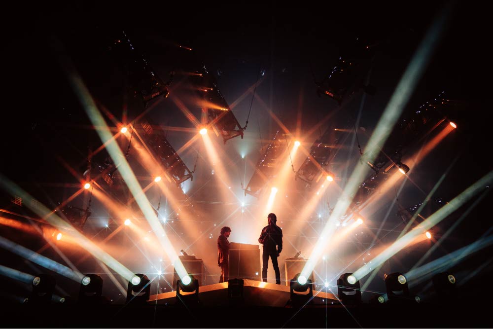 El espectáculo es mínimo, pero nunca minimalista. Sin efectos visuales, sin utilitaria, ni siquiera la icónica cruz. Bueno… algo así. “No está físicamente ahí, pero brilla con la luz. Nos preguntamos: ¿la eliminamos? Nadie estuvo de acuerdo, así que salió del escenario, pero no de la mente de la gente. Dejarla ahora sería como abandonar el ejército tres días antes de la baja”, comenta Xavier. ¿Los monolitos LED y las torres Marshall? Descartados como armaduras escénicas que ya no necesitan. En su lugar: luz; pura, blanca, convertida en arma. “Esa estética cargada de videos, muy techno, no nos pega”, explica Xavier. “No crecimos en la cultura rave. En el escenario, las imágenes figurativas le quitan protagonismo a la música. La luz, en cambio, nos permite contar historias abstractas”.