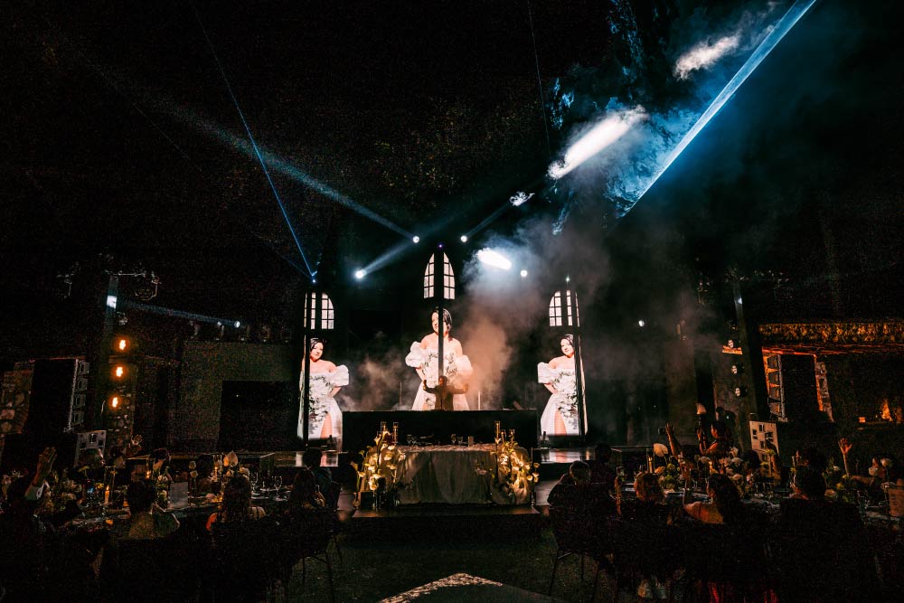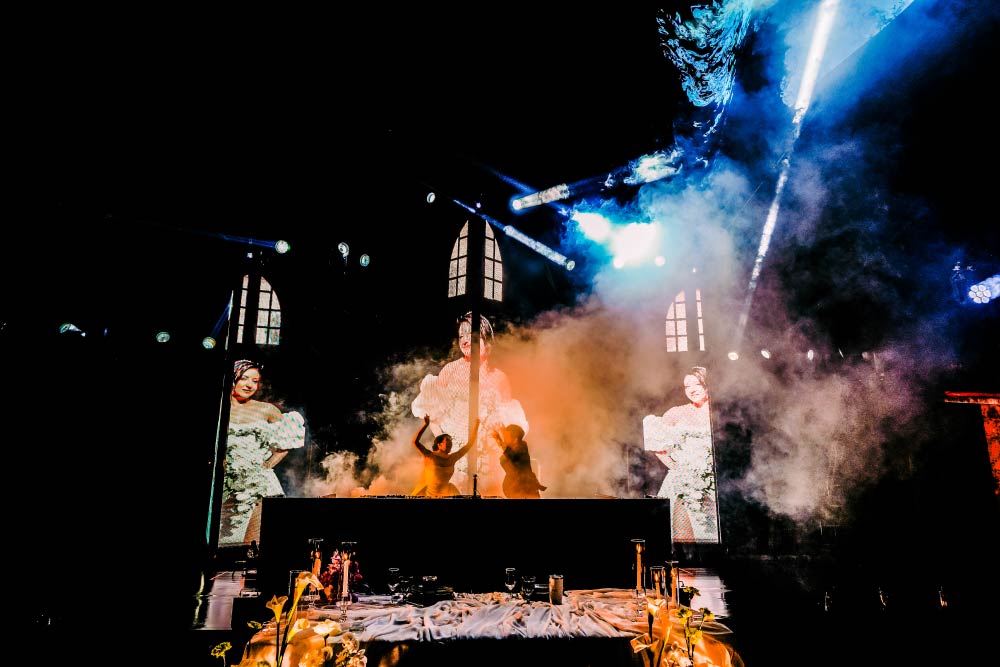 La Entrada de los novios no debe pasar desapercibida, debe ser algo que arranque suspiros y reafirme el poder simbólico del amor y del ser la novia en una boda. Que mejor que hacerlo suspendiendo en el Drop de Next To Me” de RÜFÜS DU SOL una proyección de la novia y su aparición mágica como sucedió en esta noche, lo que rompe la entrada tradicional y marca un hito en las nuevas eras nupciales