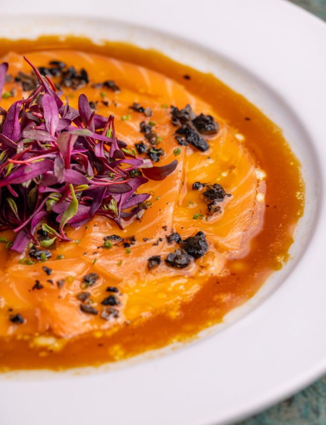 La propuesta culinaria, bajo la dirección del chef ejecutivo Peleg Miron, se distingue por platos de inspiración asiática que destacan por la frescura de sus ingredientes y una presentación sofisticada. Opciones como el hamachi con ponzu y jalapeño, el tartar de atún con jengibre y soja, y el arroz crujiente de atún con alioli de chile, son ejemplos de su enfoque experimental, combinando sabores con técnicas de alta cocina.